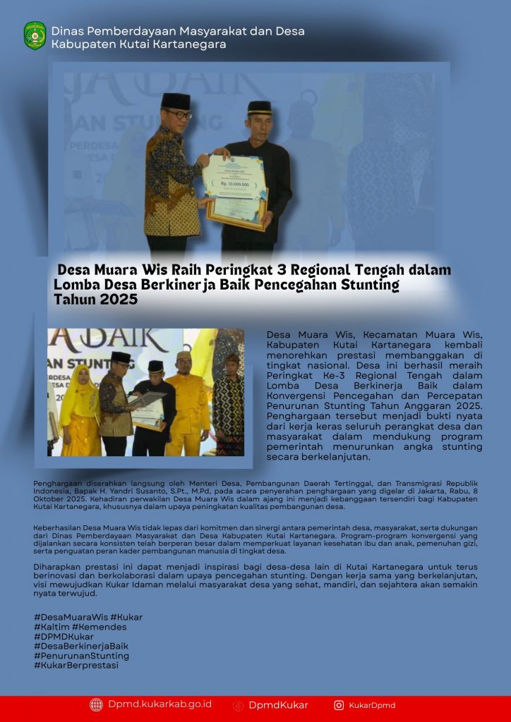 DPMD KUKAR Desa Muara Wis Raih Peringkat 3 Regional Tengah dalam Lomba Desa Berkinerja Baik Pencegahan Stunting Tahun 2025 Oktober 9, 2025 /