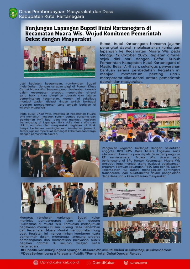 DPMD KUKAR Kunjungan Lapangan Bupati Kutai Kartanegara di Kecamatan Muara Wis “Wujud Komitmen Pemerintah Dekat dengan Masyarakat” Oktober 13, 2025 /